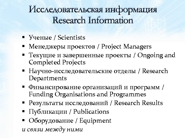 Исследовательская информация Research Information § Ученые / Scientists § Менеджеры проектов / Project Managers § Текущие и завершенные проекты / Ongoing and Completed Projects § Научно-исследовательские отделы / Research Departments § Финансирование организаций и программ / Funding Organisations and Programmes § Результаты исследований / Research Results § Публикации / Publications § Оборудование / Equipment и связи между ними