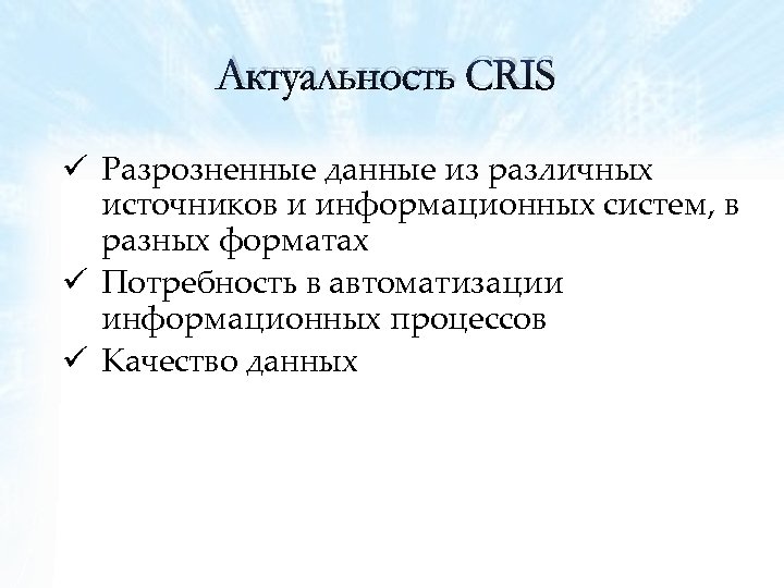 Актуальность CRIS ü Разрозненные данные из различных источников и информационных систем, в разных форматах ü Потребность в автоматизации информационных процессов ü Качество данных
