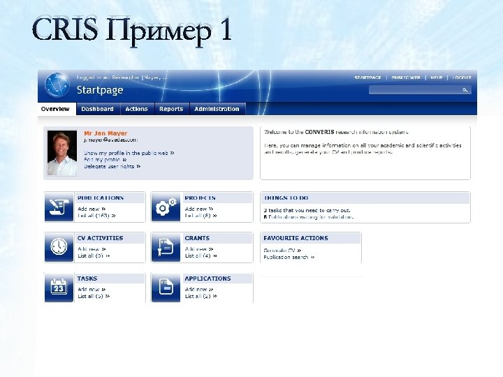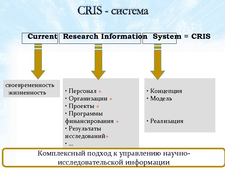 CRIS - система Current Research Information System = CRIS своевременность жизненность • Персонал + • Организации + • Проекты + • Программы финансирования + • Результаты исследований+ • … • Концепция • Модель • Реализация Комплексный подход к управлению научноисследовательской информации