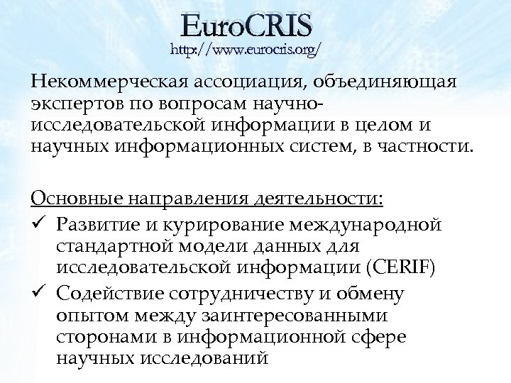 Euro. CRIS http: //www. eurocris. org/ Некоммерческая ассоциация, объединяющая экспертов по вопросам научноисследовательской информации в целом и научных информационных систем, в частности. Основные направления деятельности: ü Развитие и курирование международной стандартной модели данных для исследовательской информации (CERIF) ü Содействие сотрудничеству и обмену опытом между заинтересованными сторонами в информационной сфере научных исследований