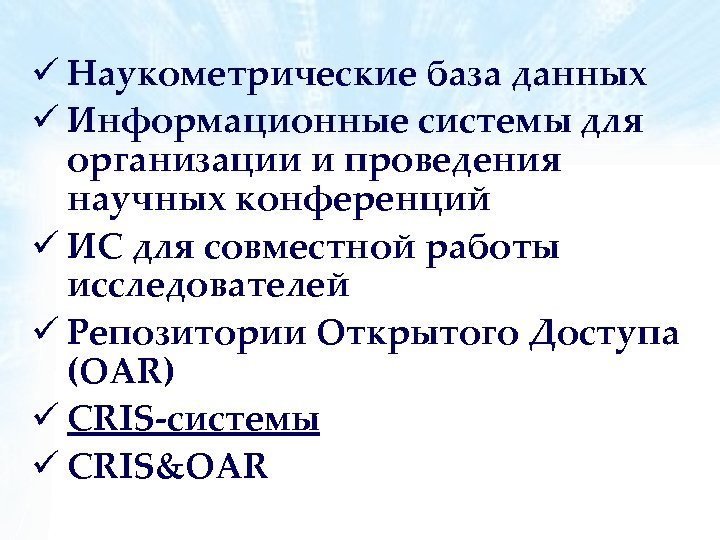 ü Наукометрические база данных ü Информационные системы для организации и проведения научных конференций ü ИC для совместной работы исследователей ü Репозитории Открытого Доступа (OAR) ü CRIS-системы ü CRIS&OAR