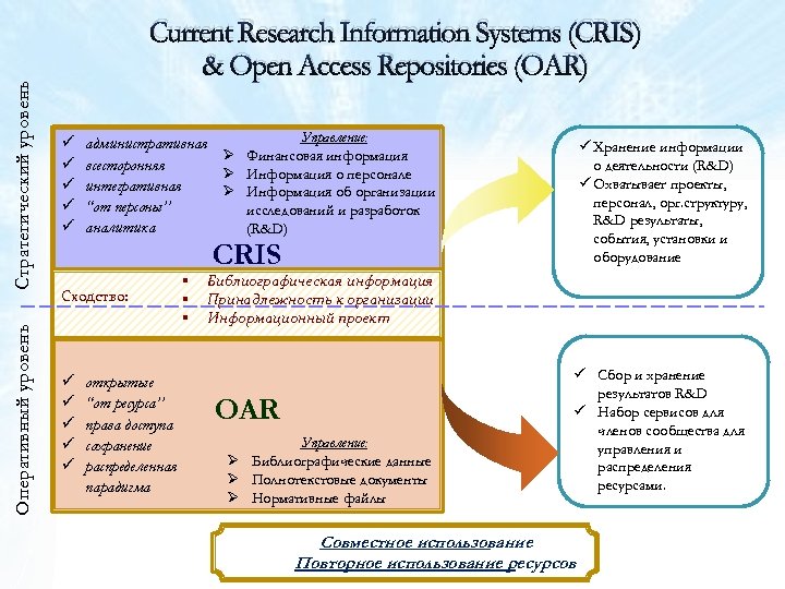 Стратегический уровень ü ü ü Оперативный уровень Current Research Information Systems (CRIS) & Open Access Repositories (OAR) ü ü ü Управление: административная Ø Финансовая информация всесторонняя Ø Информация о персонале интегративная Ø Информация об организации “от персоны” исследований и разработок аналитика (R&D) ü Хранение информации о деятельности (R&D) ü Охватывает проекты, персонал, орг. структуру, R&D результаты, события, установки и оборудование CRIS Сходство: открытые “от ресурса” права доступа сохранение распределенная парадигма § § § Библиографическая информация Принадлежность к организации Информационный проект OAR Управление: Ø Библиографические данные Ø Полнотекстовые документы Ø Нормативные файлы ü Сбор и хранение результатов R&D ü Набор сервисов для членов сообщества для управления и распределения ресурсами. Совместное использование Повторное использование ресурсов