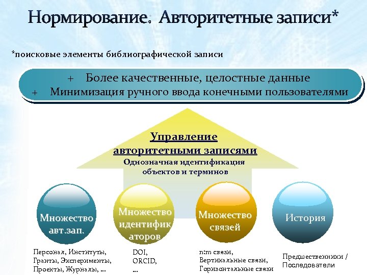 Нормирование: Авторитетные записи* *поисковые элементы библиографической записи + + Более качественные, целостные данные Минимизация ручного ввода конечными пользователями Управление авторитетными записями Однозначная идентификация объектов и терминов Множество авт. зап. Персонал, Институты, Гранты, Эксперименты, Проекты, Журналы, … Множество идентифик аторов DOI, ORCID, . . . Множество связей n: m связи, Вертикальные связи, Горизонтальные связи История Предшественники / Последователи