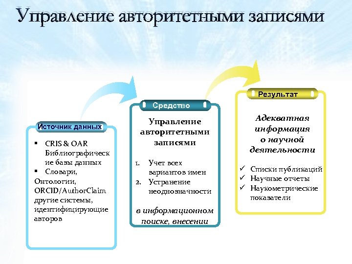 Управление авторитетными записями Результат Средство Управление авторитетными записями Источник данных § CRIS & OAR Библиографическ ие базы данных § Словари, Онтологии, ORCID/Author. Claim другие системы, идентифицирующие авторов 1. Учет всех вариантов имен 2. Устранение неоднозначности в информационном поиске, внесении Адекватная информация о научной деятельности ü Списки публикаций ü Научные отчеты ü Наукометрические показатели