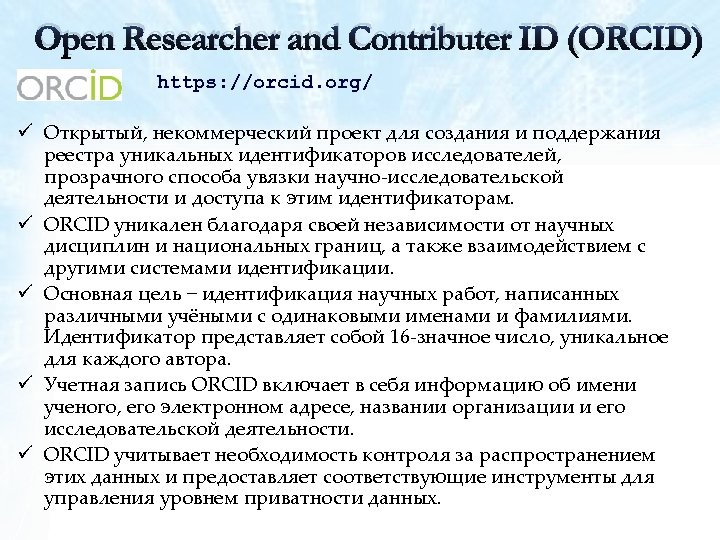 Open Researcher and Contributer ID (ORCID) https: //orcid. org/ ü Открытый, некоммерческий проект для создания и поддержания реестра уникальных идентификаторов исследователей, прозрачного способа увязки научно-исследовательской деятельности и доступа к этим идентификаторам. ü ORCID уникален благодаря своей независимости от научных дисциплин и национальных границ, а также взаимодействием с другими системами идентификации. ü Основная цель идентификация научных работ, написанных различными учёными с одинаковыми именами и фамилиями. Идентификатор представляет собой 16 -значное число, уникальное для каждого автора. ü Учетная запись ORCID включает в себя информацию об имени ученого, его электронном адресе, названии организации и его исследовательской деятельности. ü ORCID учитывает необходимость контроля за распространением этих данных и предоставляет соответствующие инструменты для управления уровнем приватности данных.