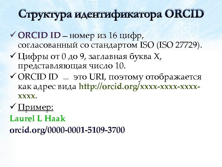 Структура идентификатора ORCID ü ORCID ID номер из 16 цифр, согласованный со стандартом ISO (ISO 27729). ü Цифры от 0 до 9, заглавная буква X, представляющая число 10. ü ORCID ID это URI, поэтому отображается как адрес вида http: //orcid. org/xxxx-xxxx. ü Пример: Laurel L Haak orcid. org/0000 -0001 -5109 -3700
