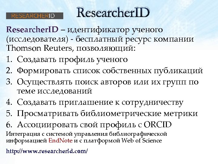 Researcher. ID – идентификатор ученого (исследователя) - бесплатный ресурс компании Thomson Reuters, позволяющий: 1. Создавать профиль ученого 2. Формировать список собственных публикаций 3. Осуществлять поиск авторов или их групп по теме исследований 4. Создавать приглашение к сотрудничеству 5. Просматривать библиометрические метрики 6. Ассоциировать свой профиль с ORCID Интеграция с системой управления библиографической информацией End. Note и с платформой Web of Science http: //www. researcherid. com/