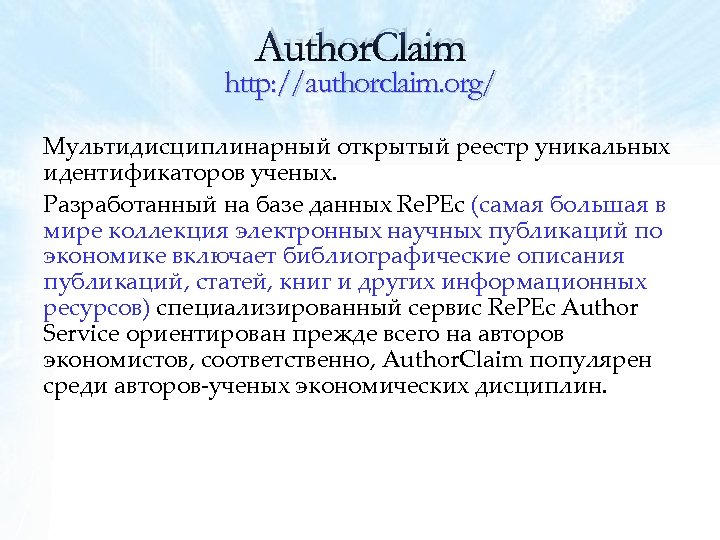Author. Claim http: //authorclaim. org/ Мультидисциплинарный открытый реестр уникальных идентификаторов ученых. Разработанный на базе данных Re. PEc (самая большая в мире коллекция электронных научных публикаций по экономике включает библиографические описания публикаций, статей, книг и других информационных ресурсов) специализированный сервис Re. PEc Author Service ориентирован прежде всего на авторов экономистов, соответственно, Author. Claim популярен среди авторов-ученых экономических дисциплин.