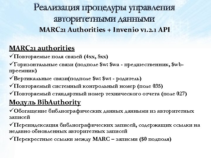 Реализация процедуры управления авторитетными данными MARC 21 Authorities + Invenio v 1. 2. 1 API MARC 21 authorities üПовторяемые поля связей (4 xx, 5 xx) üГоризонтальные связи (подполе $w: $wa - предшественник, $wbпреемник) üВертикальные связи(подполе $w: $wt - родитель) üПовторяемый системный контрольный номер (поле 035) üПовторяемый стандартный номер технического отчета (поле 027) Модуль Bib. Authority üОбогащение библиографических данными из авторитетных записей üПереиндексация библиографических записей, содержащих ссылки на недавно обновленных авторитетных записей üПерекрестные ссылки между MARC – записми ($0 подполя)