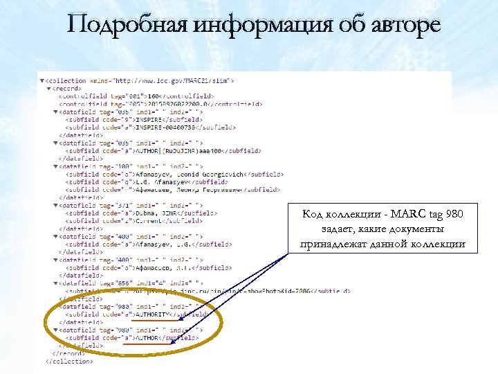 Подробная информация об авторе Код коллекции - MARC tag 980 задает, какие документы принадлежат данной коллекции