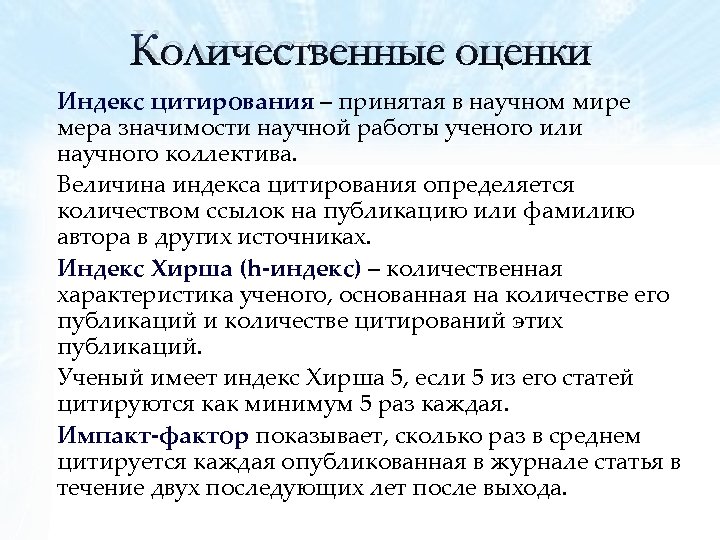Количественные оценки Индекс цитирования – принятая в научном мире мера значимости научной работы ученого или научного коллектива. Величина индекса цитирования определяется количеством ссылок на публикацию или фамилию автора в других источниках. Индекс Хирша (h-индекс) – количественная характеристика ученого, основанная на количестве его публикаций и количестве цитирований этих публикаций. Ученый имеет индекс Хирша 5, если 5 из его статей цитируются как минимум 5 раз каждая. Импакт-фактор показывает, сколько раз в среднем цитируется каждая опубликованная в журнале статья в течение двух последующих лет после выхода.