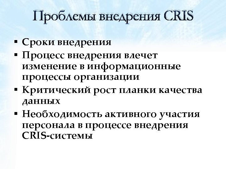 Проблемы внедрения CRIS § Сроки внедрения § Процесс внедрения влечет изменение в информационные процессы организации § Критический рост планки качества данных § Необходимость активного участия персонала в процессе внедрения CRIS-системы