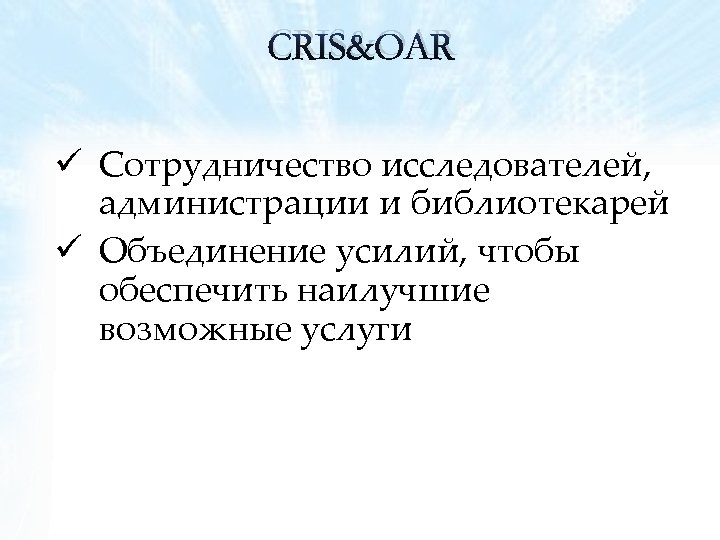 CRIS&OAR ü Сотрудничество исследователей, администрации и библиотекарей ü Объединение усилий, чтобы обеспечить наилучшие возможные услуги