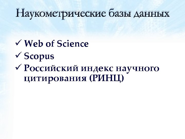 Наукометрические базы данных ü Web of Science ü Scopus ü Российский индекс научного цитирования (РИНЦ)