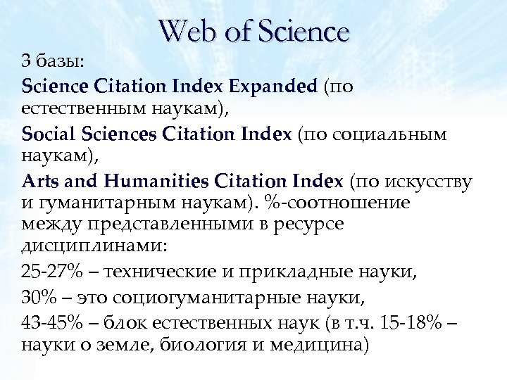 Web of Science 3 базы: Science Citation Index Expanded (по естественным наукам), Social Sciences Citation Index (по социальным наукам), Arts and Humanities Citation Index (по искусству и гуманитарным наукам). %-соотношение между представленными в ресурсе дисциплинами: 25 -27% – технические и прикладные науки, 30% – это социогуманитарные науки, 43 -45% – блок естественных наук (в т. ч. 15 -18% – науки о земле, биология и медицина)