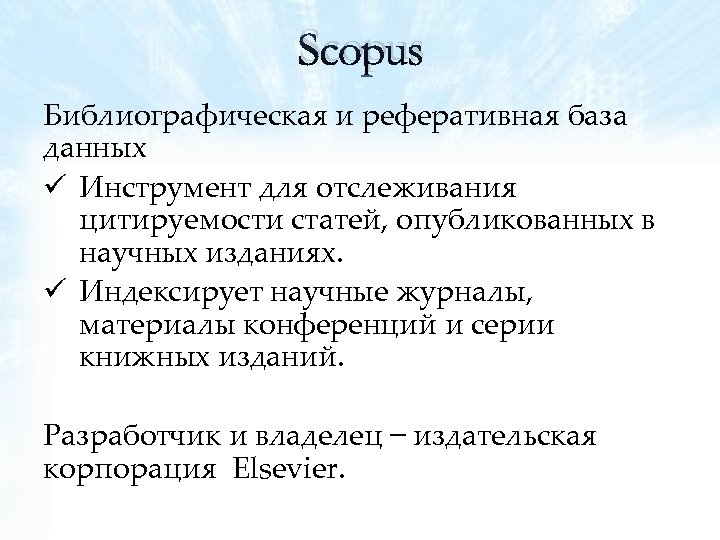 Scopus Библиографическая и реферативная база данных ü Инструмент для отслеживания цитируемости статей, опубликованных в научных изданиях. ü Индексирует научные журналы, материалы конференций и серии книжных изданий. Разработчик и владелец издательская корпорация Elsevier.