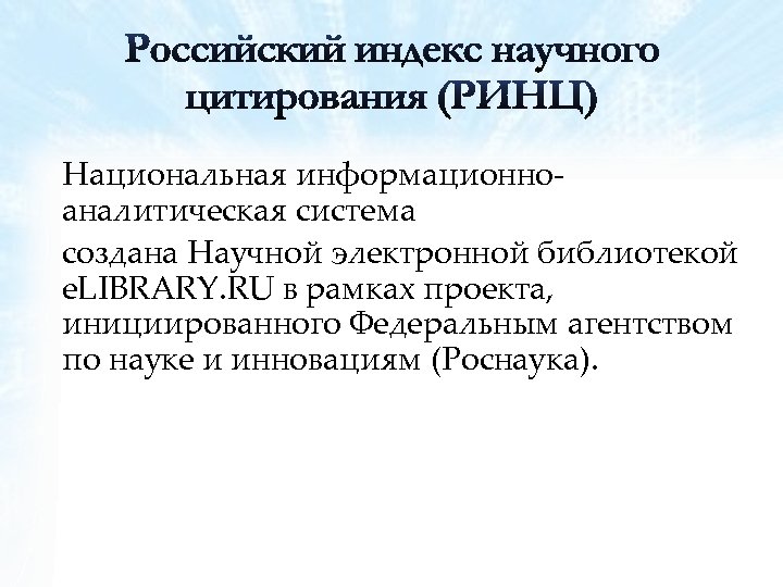 Национальная информационноаналитическая система создана Научной электронной библиотекой e. LIBRARY. RU в рамках проекта, инициированного Федеральным агентством по науке и инновациям (Роснаука).