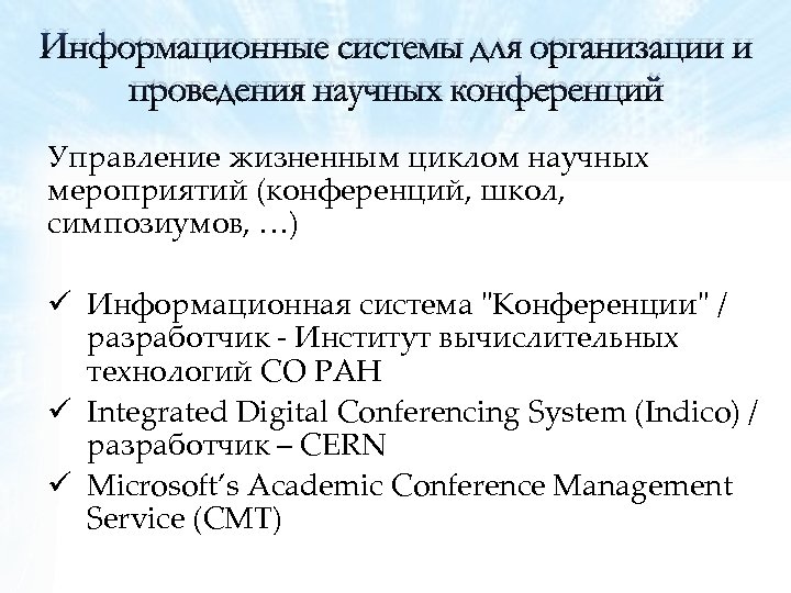 Информационные системы для организации и проведения научных конференций Управление жизненным циклом научных мероприятий (конференций, школ, симпозиумов, …) ü Информационная система "Конференции" / разработчик - Институт вычислительных технологий СО РАН ü Integrated Digital Conferencing System (Indico) / разработчик – CERN ü Microsoft’s Academic Conference Management Service (CMT)