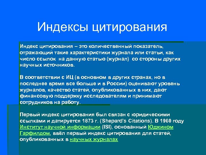 Индексы цитирования Индекс цитирования – это количественный показатель, отражающий такие характеристики журнала или статьи, как число ссылок на данную статью (журнал) со стороны других научных источников. В соответствии с ИЦ (в основном в других странах, но в последнее время все больше и в России) оценивают уровень журналов, качество статей, опубликованных в них, дают финансовую поддержку исследователям и принимают сотрудников на работу. Первый индекс цитирования был связан с юридическими ссылками и датируется 1873 г. (Shepard’s Citations). В 1960 году Институт научной информации (ISI), основанный Юджином Гарфилдом, ввёл первый индекс цитирования для статей, опубликованных в научных журналах