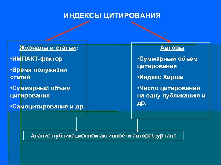 ИНДЕКСЫ ЦИТИРОВАНИЯ Журналы и статьи: • ИМПАКТ-фактор • Время полужизни статей • Суммарный объем цитирования • Самоцитирование и др. Авторы • Суммарный объем цитирования • Индекс Хирша • Число цитирований на одну публикацию и др. Анализ публикационной активности автора/журнала