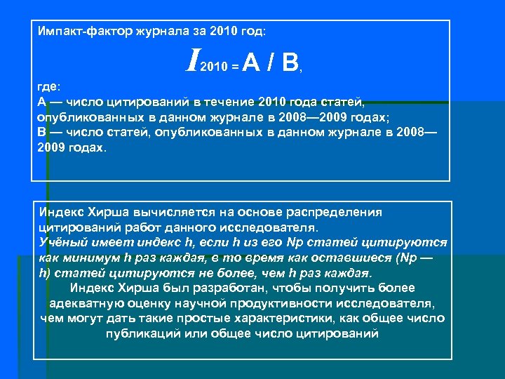 Импакт-фактор журнала за 2010 год: I 2010 = A / B, где: A — число цитирований в течение 2010 года статей, опубликованных в данном журнале в 2008— 2009 годах; B — число статей, опубликованных в данном журнале в 2008— 2009 годах. Индекс Хирша вычисляется на основе распределения цитирований работ данного исследователя. Учёный имеет индекс h, если h из его Np статей цитируются как минимум h раз каждая, в то время как оставшиеся (Np — h) статей цитируются не более, чем h раз каждая. Индекс Хирша был разработан, чтобы получить более адекватную оценку научной продуктивности исследователя, чем могут дать такие простые характеристики, как общее число публикаций или общее число цитирований