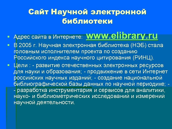 Сайт Научной электронной библиотеки www. elibrary. ru § Адрес сайта в Интернете: § В 2005 г. Научная электронная библиотека (НЭБ) стала головным исполнителем проекта по созданию Российского индекса научного цитирования (РИНЦ). § Цели : - развитие отечественных электронных ресурсов для науки и образования; - продвижение в сети Интернет российских научных изданий; - создание национальной библиографической базы данных по научной периодике; - разработка инструментария и сервисов для аналитики, науко- и библиометрических исследований и измерений научной деятельности.