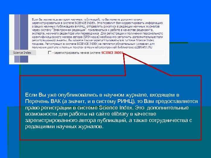 Если Вы уже опубликовались в научном журнале, входящем в Перечень ВАК (а значит, и в систему РИНЦ), то Вам предоставляется право регистрации в системе Science Index. Это дополнительные возможности для работы на сайте elibrary в качестве зарегистрированного автора публикаций, а также сотрудничества с редакциями научных журналов.