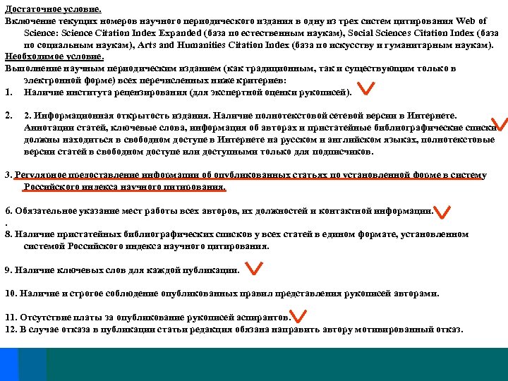 Достаточное условие. Включение текущих номеров научного периодического издания в одну из трех систем цитирования Web of Science: Science Citation Index Expanded (база по естественным наукам), Social Sciences Citation Index (база по социальным наукам), Arts and Humanities Citation Index (база по искусству и гуманитарным наукам). Необходимое условие. Выполнение научным периодическим изданием (как традиционным, так и существующим только в электронной форме) всех перечисленных ниже критериев: 1. Наличие института рецензирования (для экспертной оценки рукописей). 2. Информационная открытость издания. Наличие полнотекстовой сетевой версии в Интернете. Аннотации статей, ключевые слова, информация об авторах и пристатейные библиографические списки должны находиться в свободном доступе в Интернете на русском и английском языках, полнотекстовые версии статей в свободном доступе или доступными только для подписчиков. 3. Регулярное предоставление информации об опубликованных статьях по установленной форме в систему Российского индекса научного цитирования. 6. Обязательное указание мест работы всех авторов, их должностей и контактной информации. . 8. Наличие пристатейных библиографических списков у всех статей в едином формате, установленном системой Российского индекса научного цитирования. 9. Наличие ключевых слов для каждой публикации. 10. Наличие и строгое соблюдение опубликованных правил представления рукописей авторами. 11. Отсутствие платы за опубликование рукописей аспирантов. 12. В случае отказа в публикации статьи редакция обязана направить автору мотивированный отказ.