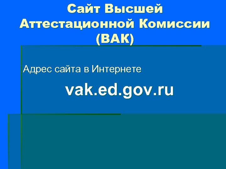 Сайт Высшей Аттестационной Комиссии (ВАК) Адрес сайта в Интернете vak. ed. gov. ru