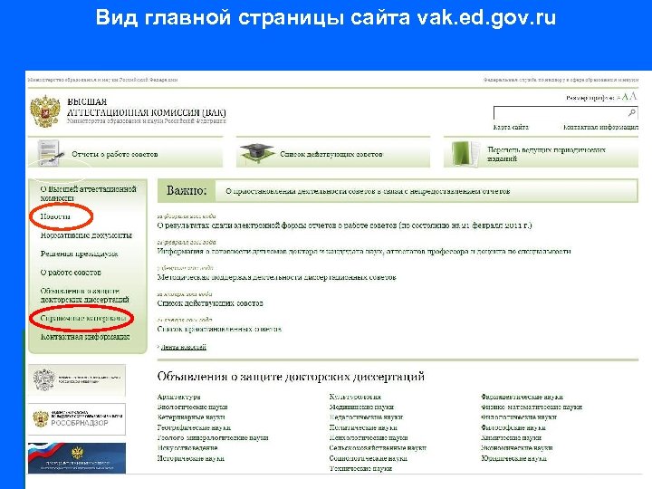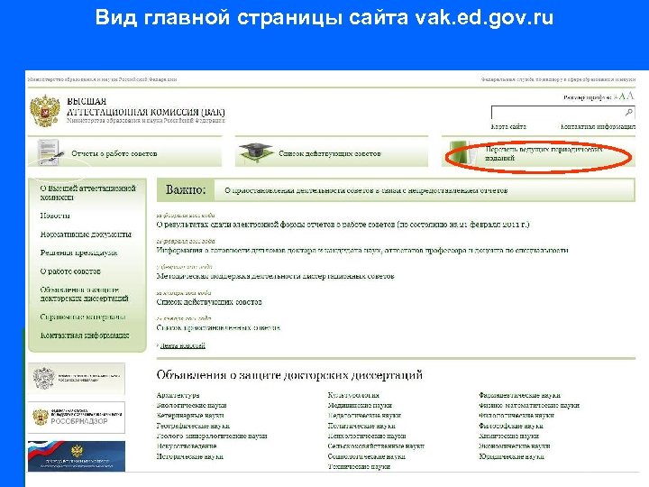 Вид главной страницы сайта vak. ed. gov. ru