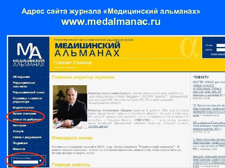Адрес сайта журнала «Медицинский альманах» www. medalmanac. ru