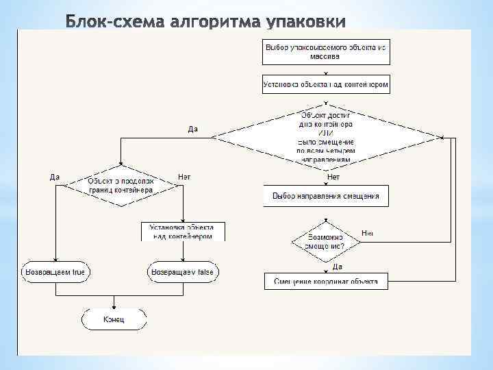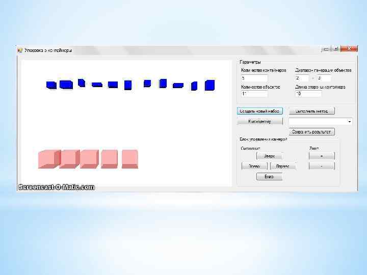 Упаковка объекта в контейнер происходит по следующему принципу: 1. Объект помещается над контейнером в левом дальнем углу; 2. Затем объект перемещается вниз по оси Oy до тех пор, пока он либо не достигнет дна контейнера, либо не столкнется с другим объектом; 3. Если имело место быть столкновение с другим объектом, текущий объект перемещается по оси Oz до упора, после этого возвращаемся в пункту 2; 4. Если дно так и не было достигнуто, перебираются все 4 направления по координатным осям до тех пор, пока либо объект не достигнет дна контейнера, либо не будут проверены все 4 направления.