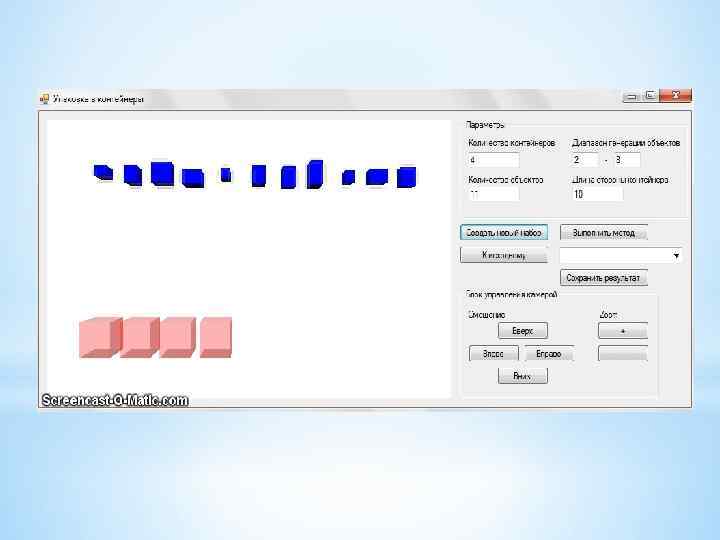 • • • Были решены следующие задачи: Изучены алгоритмы упаковки объектов в контейнеры; Исследование различных алгоритмов упаковки; Изучены компьютерные методы построения трехмерной компьютерной графики; Выбор оптимального алгоритма упаковки трехмерных объектов; Разработано приложение для реализации и исследования задачи трехмерной упаковки; Проведен анализ эффективности алгоритмов по качественным критериям.