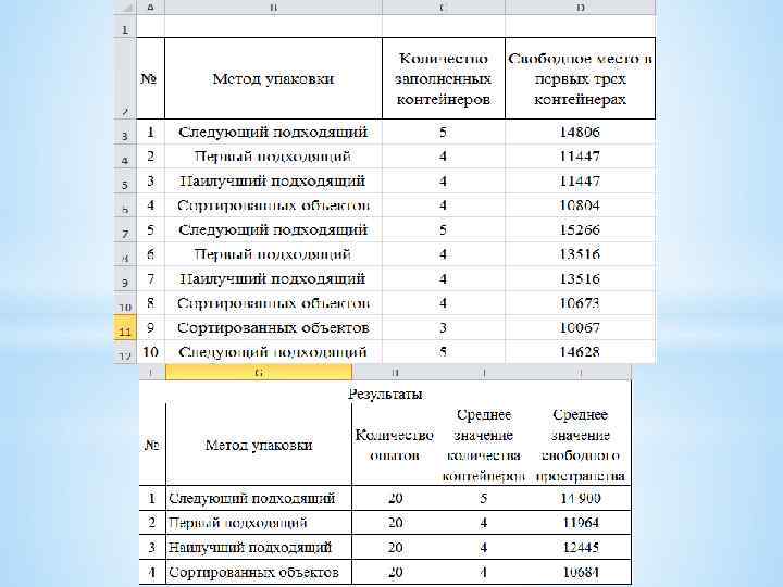 Результаты упаковки сохраняются в файл Excel. Передаваемые значения: • • • Количество заполненных контейнеров; • Среднее значение свободного пространства среди всех проведенных опытов. Свободный объем в первых трех контейнерах; Среднее значение количества контейнеров среди всех проведенных опытов;