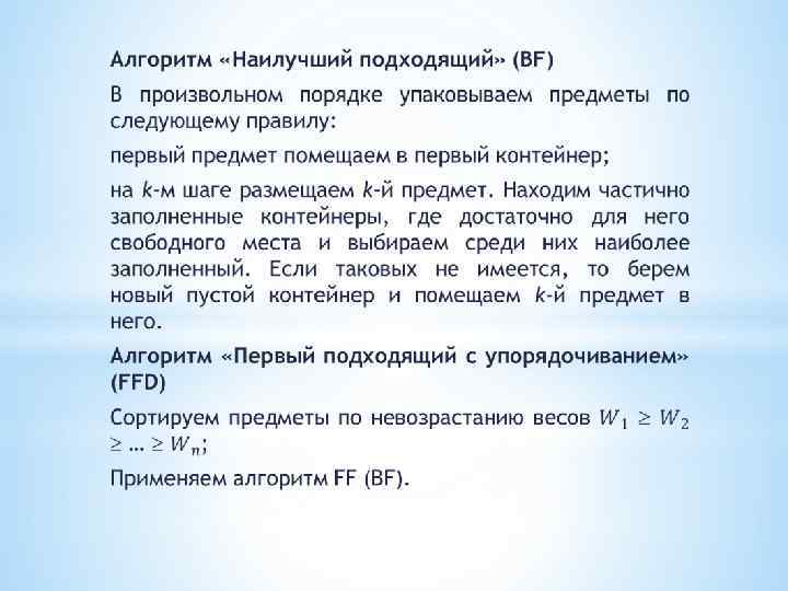 Алгоритм «Первый подходящий» (FF) В произвольном порядке упаковываем предметы по следующему правилу. Первый предмет помещаем в первый контейнер. На k-м шаге находим контейнер с наименьшим номером, куда помещается k-й предмет, и помещаем его туда. Если такого контейнера нет, то берем новый пустой контейнер и помещаем предмет в него.