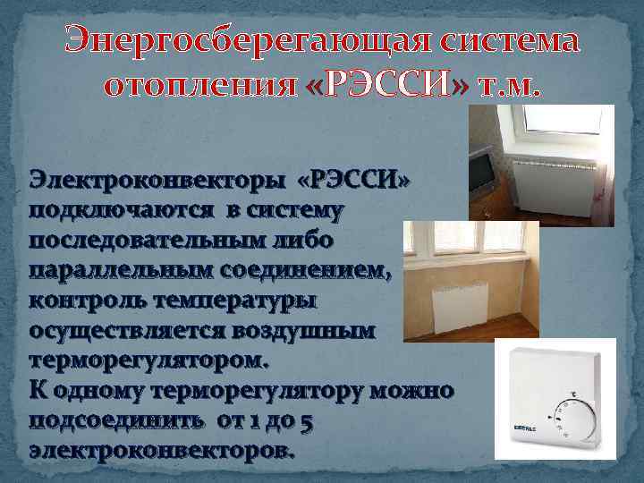 Энергосберегающая система отопления «РЭССИ» т. м. Электроконвекторы «РЭССИ» подключаются в систему последовательным либо параллельным соединением, контроль температуры осуществляется воздушным терморегулятором. К одному терморегулятору можно подсоединить от 1 до 5 электроконвекторов.