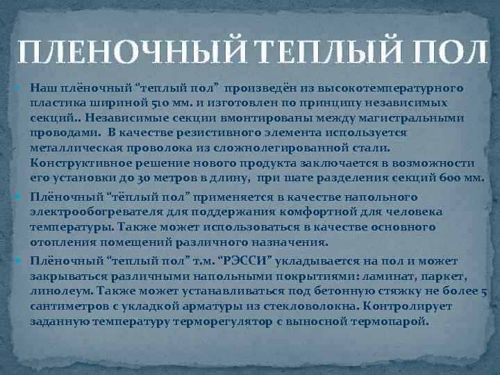 ПЛЕНОЧНЫЙ ТЕПЛЫЙ ПОЛ Наш плёночный “теплый пол” произведён из высокотемпературного пластика шириной 510 мм. и изготовлен по принципу независимых секций. . Независимые секции вмонтированы между магистральными проводами. В качестве резистивного элемента используется металлическая проволока из сложнолегированной стали. Конструктивное решение нового продукта заключается в возможности его установки до 30 метров в длину, при шаге разделения секций 600 мм. Плёночный “тёплый пол” применяется в качестве напольного электрообогревателя для поддержания комфортной для человека температуры. Также может использоваться в качестве основного отопления помещений различного назначения. Плёночный “теплый пол” т. м. “РЭССИ” укладывается на пол и может закрываться различными напольными покрытиями: ламинат, паркет, линолеум. Также может устанавливаться под бетонную стяжку не более 5 сантиметров с укладкой арматуры из стекловолокна. Контролирует заданную температуру терморегулятор с выносной термопарой.