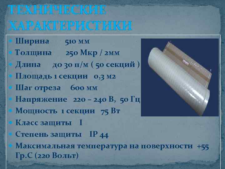 ТЕХНИЧЕСКИЕ ХАРАКТЕРИСТИКИ Ширина 510 мм Толщина 250 Мкр / 2 мм Длина до 30 п/м ( 50 секций ) Площадь 1 секции 0, 3 м 2 Шаг отреза 600 мм Напряжение 220 – 240 В, 50 Гц Мощность 1 секции 75 Вт Класс защиты I Степень защиты IP 44 Максимальная температура на поверхности +55 Гр. С (220 Вольт)