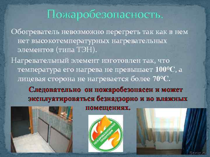 Пожаробезопасность. Обогреватель невозможно перегреть так как в нем нет высокотемпературных нагревательных элементов (типа ТЭН). Нагревательный элемент изготовлен так, что температура его нагрева не превышает 100°С, а лицевая сторона не нагревается более 70°С. Следовательно он пожаробезопасен и может эксплуатироваться безнадзорно и во влажных помещениях.