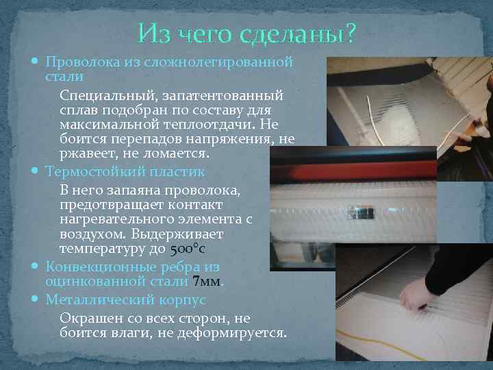 Из чего сделаны? Проволока из сложнолегированной стали Специальный, запатентованный сплав подобран по составу для максимальной теплоотдачи. Не боится перепадов напряжения, не ржавеет, не ломается. Термостойкий пластик В него запаяна проволока, предотвращает контакт нагревательного элемента с воздухом. Выдерживает температуру до 500°с Конвекционные ребра из оцинкованной стали 7 мм. Металлический корпус Окрашен со всех сторон, не боится влаги, не деформируется.
