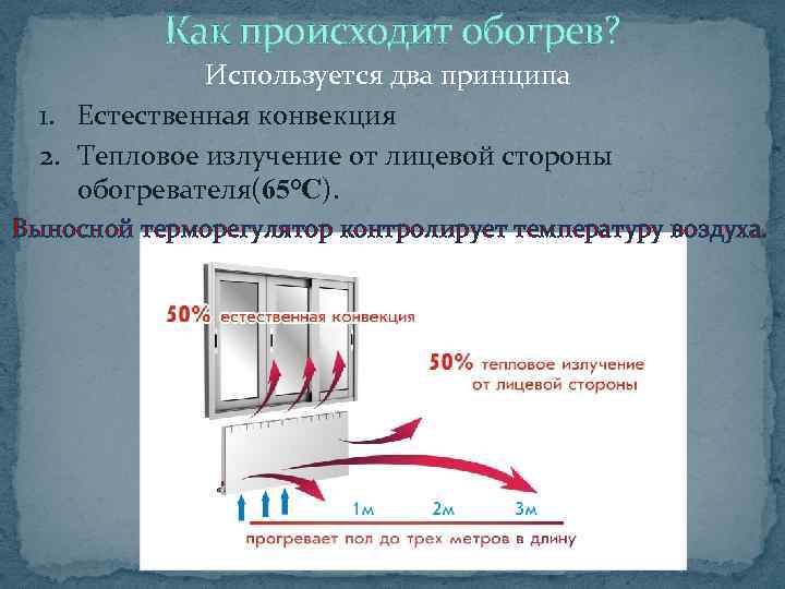 Как происходит обогрев? Используется два принципа 1. Естественная конвекция 2. Тепловое излучение от лицевой стороны обогревателя(65°С). Выносной терморегулятор контролирует температуру воздуха.