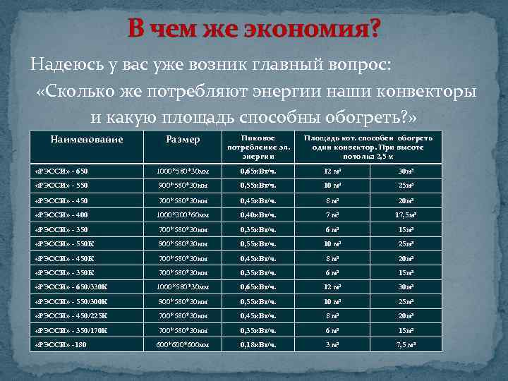 В чем же экономия? Надеюсь у вас уже возник главный вопрос: «Сколько же потребляют энергии наши конвекторы и какую площадь способны обогреть? » Наименование Размер Пиковое потребление эл. энергии «РЭССИ» - 650 1000*580*30 мм 0, 65 к. Вт/ч. 12 м² 30 м³ «РЭССИ» - 550 900*580*30 мм 0, 55 к. Вт/ч. 10 м² 25 м³ «РЭССИ» - 450 700*580*30 мм 0, 45 к. Вт/ч. 8 м² 20 м³ «РЭССИ» - 400 1000*300*60 мм 0, 40 к. Вт/ч. 7 м² 17, 5 м³ «РЭССИ» - 350 700*580*30 мм 0, 35 к. Вт/ч. 6 м² 15 м³ «РЭССИ» - 550 К 900*580*30 мм 0, 55 к. Вт/ч. 10 м² 25 м³ «РЭССИ» - 450 К 700*580*30 мм 0, 45 к. Вт/ч. 8 м² 20 м³ «РЭССИ» - 350 К 700*580*30 мм 0, 35 к. Вт/ч. 6 м² 15 м³ «РЭССИ» - 650/330 К 1000*580*30 мм 0, 65 к. Вт/ч. 12 м² 30 м³ «РЭССИ» - 550/300 К 900*580*30 мм 0, 55 к. Вт/ч. 10 м² 25 м³ «РЭССИ» - 450/225 К 700*580*30 мм 0, 45 к. Вт/ч. 8 м² 20 м³ «РЭССИ» - 350/170 К 700*580*30 мм 0, 35 к. Вт/ч. 6 м² 15 м³ «РЭССИ» -180 600*600 мм 0, 18 к. Вт/ч. 3 м² 7, 5 м³ Площадь кот. способен обогреть один конвектор. При высоте потолка 2, 5 м