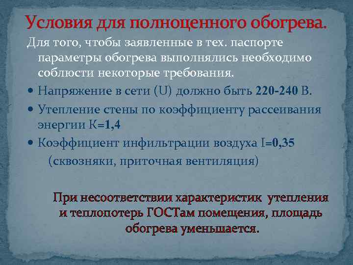 Условия для полноценного обогрева. Для того, чтобы заявленные в тех. паспорте параметры обогрева выполнялись необходимо соблюсти некоторые требования. Напряжение в сети (U) должно быть 220 -240 В. Утепление стены по коэффициенту рассеивания энергии К=1, 4 Коэффициент инфильтрации воздуха I=0, 35 (сквозняки, приточная вентиляция) При несоответствии характеристик утепления и теплопотерь ГОСТам помещения, площадь обогрева уменьшается.