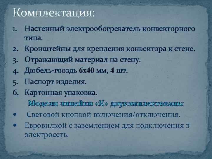 Комплектация: 1. Настенный электрообогреватель конвекторного типа. 2. Кронштейны для крепления конвектора к стене. 3. Отражающий материал на стену. 4. Дюбель-гвоздь 6 х40 мм, 4 шт. 5. Паспорт изделия. 6. Картонная упаковка. Модели линейки «К» доукомплектованы Световой кнопкой включения/отключения. Евровилкой с заземлением для подключения в электросеть.