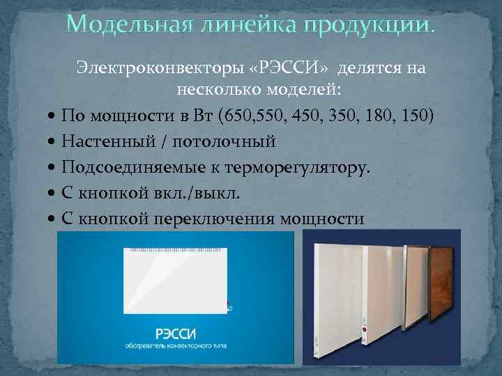 Модельная линейка продукции. Электроконвекторы «РЭССИ» делятся на несколько моделей: По мощности в Вт (650, 550, 450, 350, 180, 150) Настенный / потолочный Подсоединяемые к терморегулятору. С кнопкой вкл. /выкл. С кнопкой переключения мощности