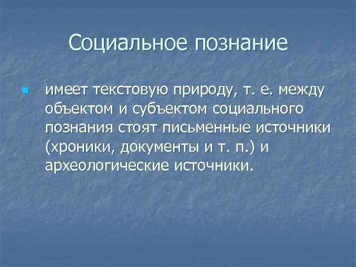 Социальное познание n имеет текстовую природу, т. е. между объектом и субъектом социального познания стоят письменные источники (хроники, документы и т. п. ) и археологические источники.