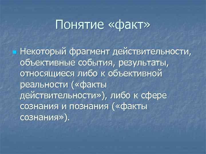 Понятие «факт» n Некоторый фрагмент действительности, объективные события, результаты, относящиеся либо к объективной реальности ( «факты действительности» ), либо к сфере сознания и познания ( «факты сознания» ).