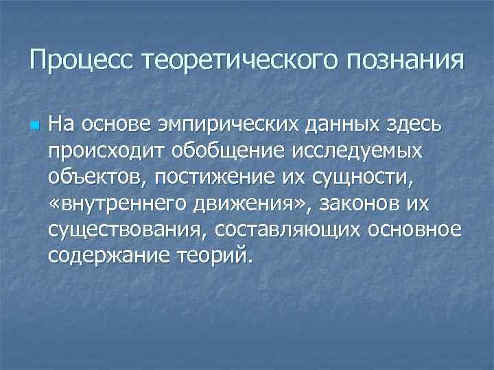 Процесс теоретического познания n На основе эмпирических данных здесь происходит обобщение исследуемых объектов, постижение их сущности, «внутреннего движения» , законов их существования, составляющих основное содержание теорий.