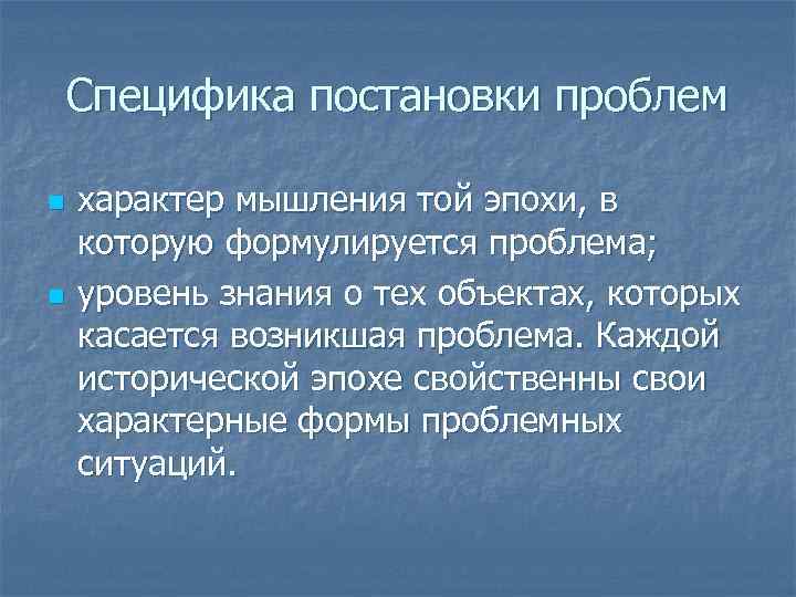 Специфика постановки проблем n n характер мышления той эпохи, в которую формулируется проблема; уровень знания о тех объектах, которых касается возникшая проблема. Каждой исторической эпохе свойственны свои характерные формы проблемных ситуаций.