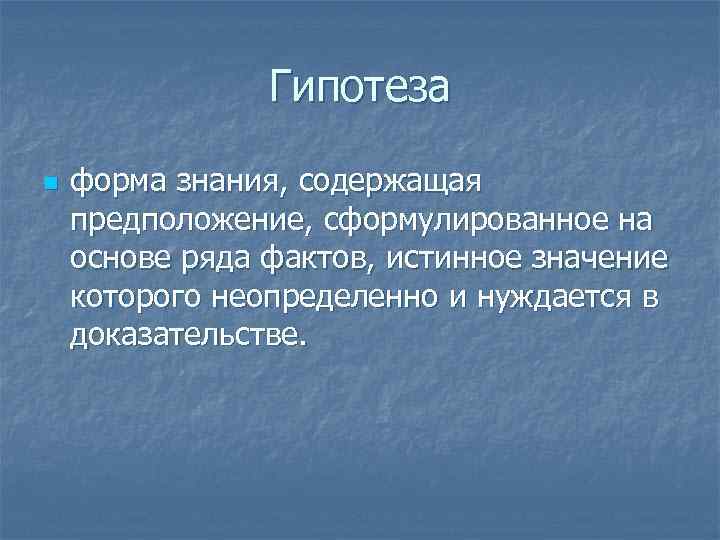 Гипотеза n форма знания, содержащая предположение, сформулированное на основе ряда фактов, истинное значение которого неопределенно и нуждается в доказательстве.